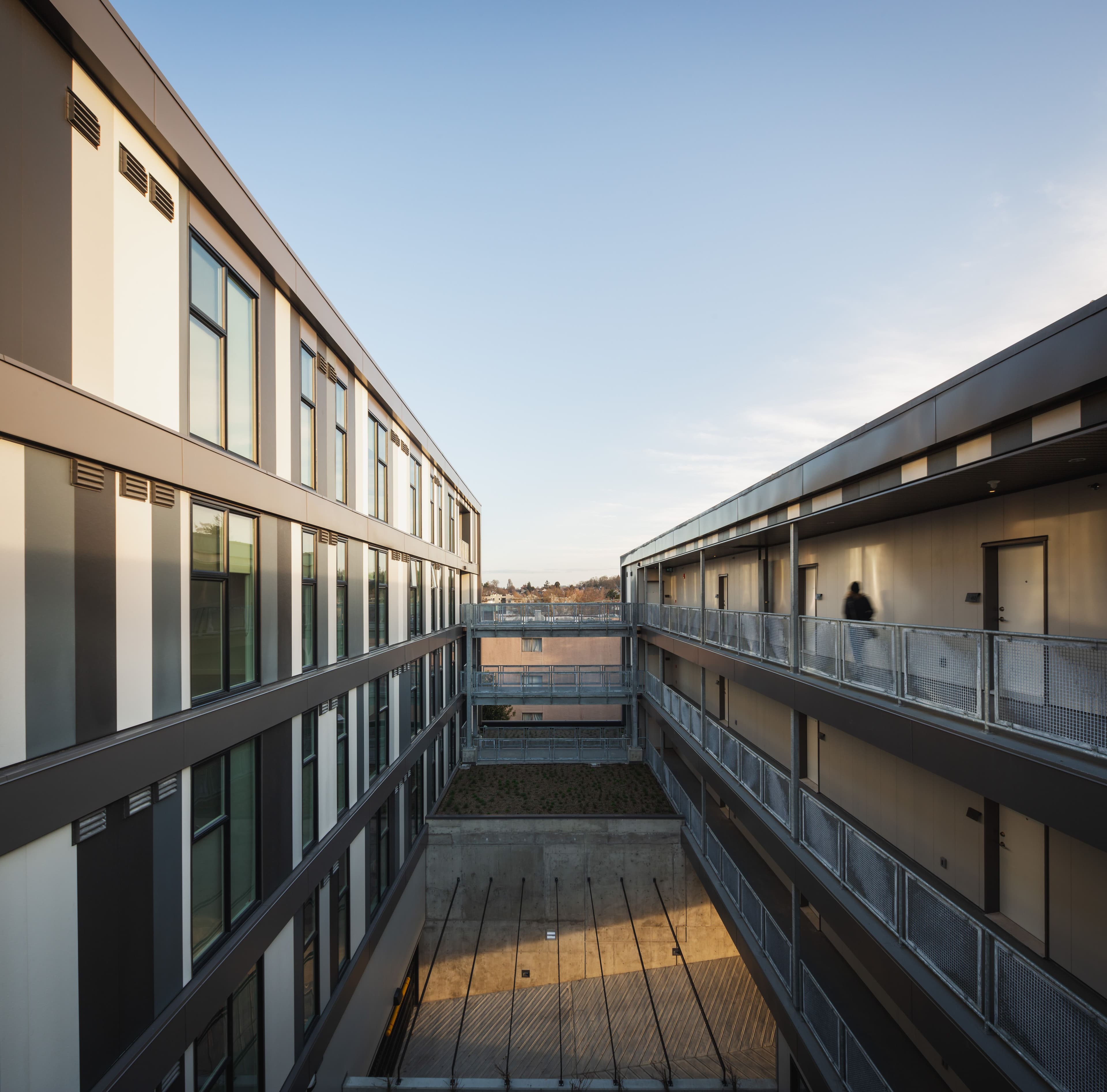 Open air building corridors across a planted courtyard connects residents to each other and the natural urban surroundings.